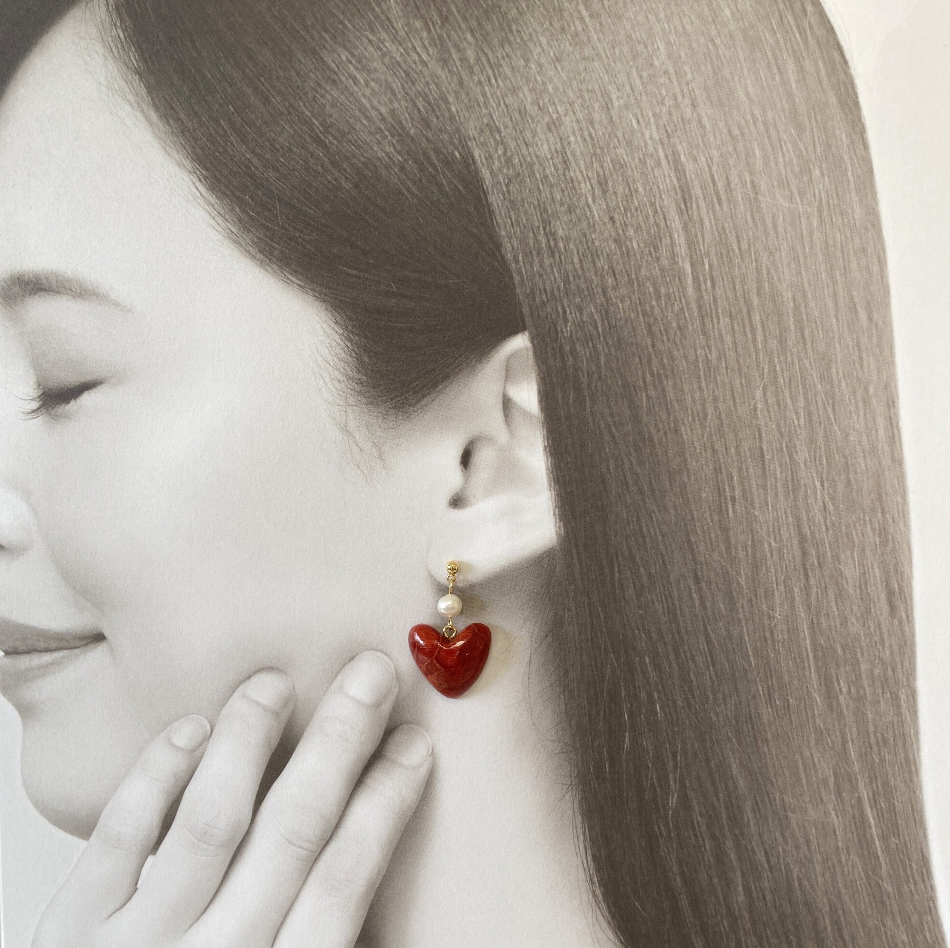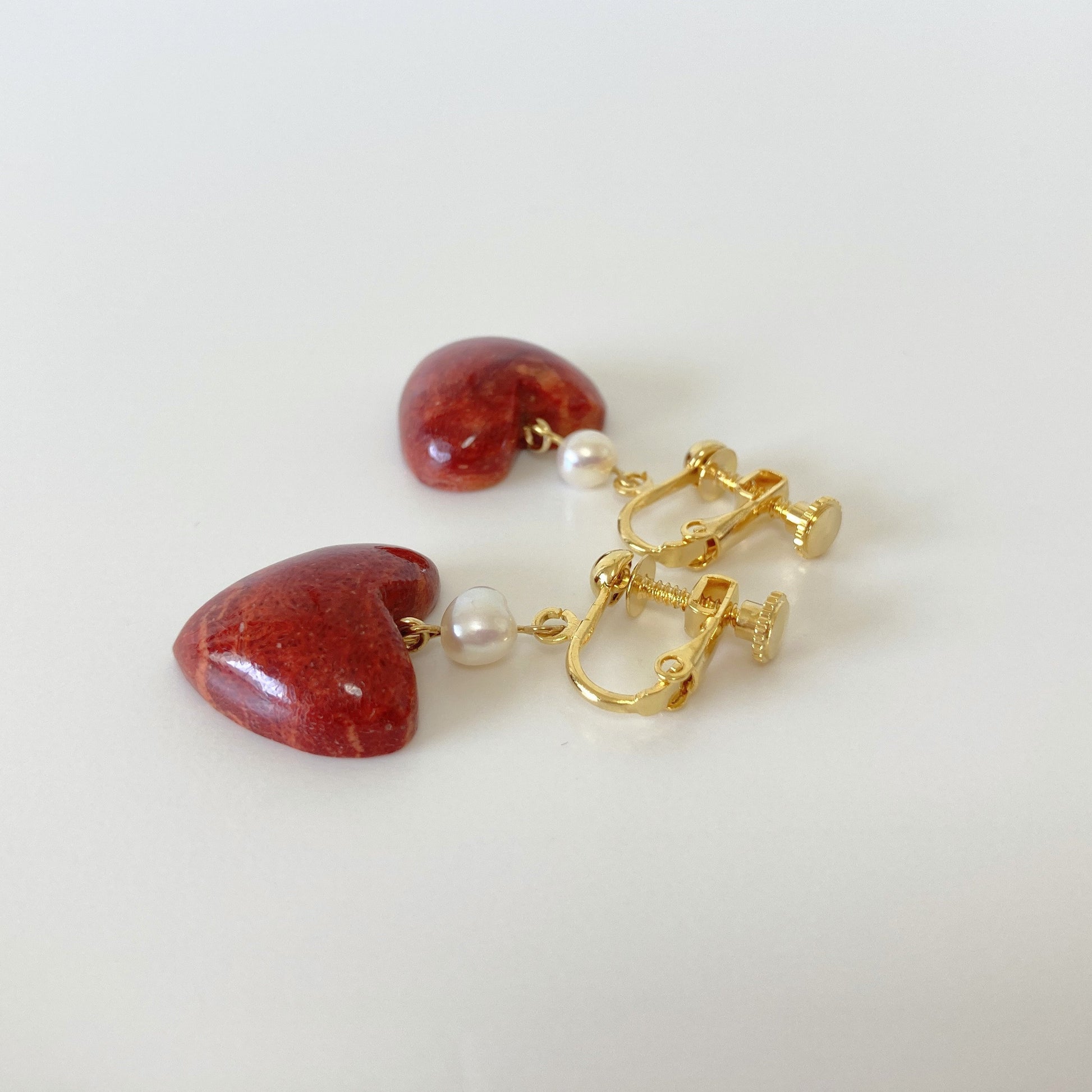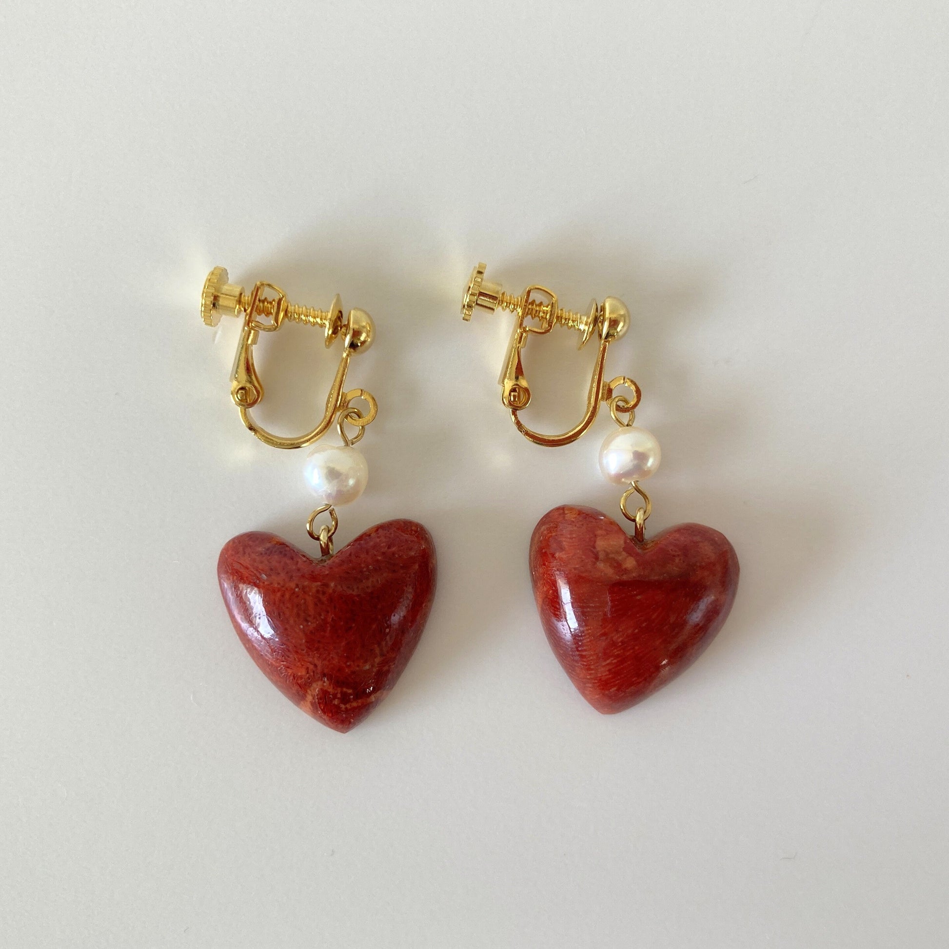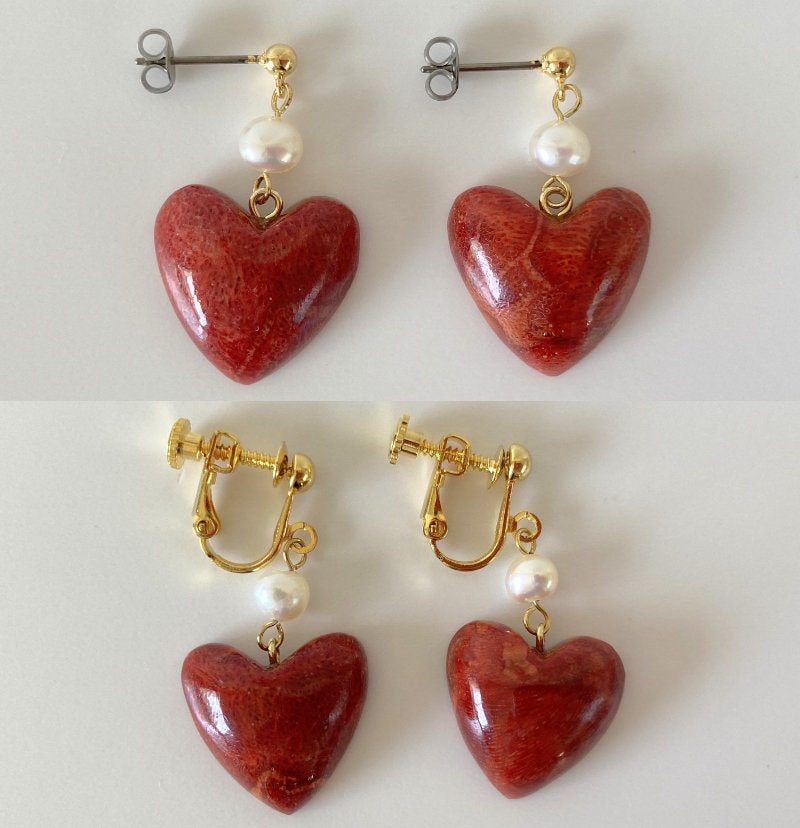 Sponge Coral Stud Earring or Screw Clip Earring, Heart shape natural African coral and fresh water pearl, Dangle and drop, Genuine coral, Please choose from either of 2 kinds.