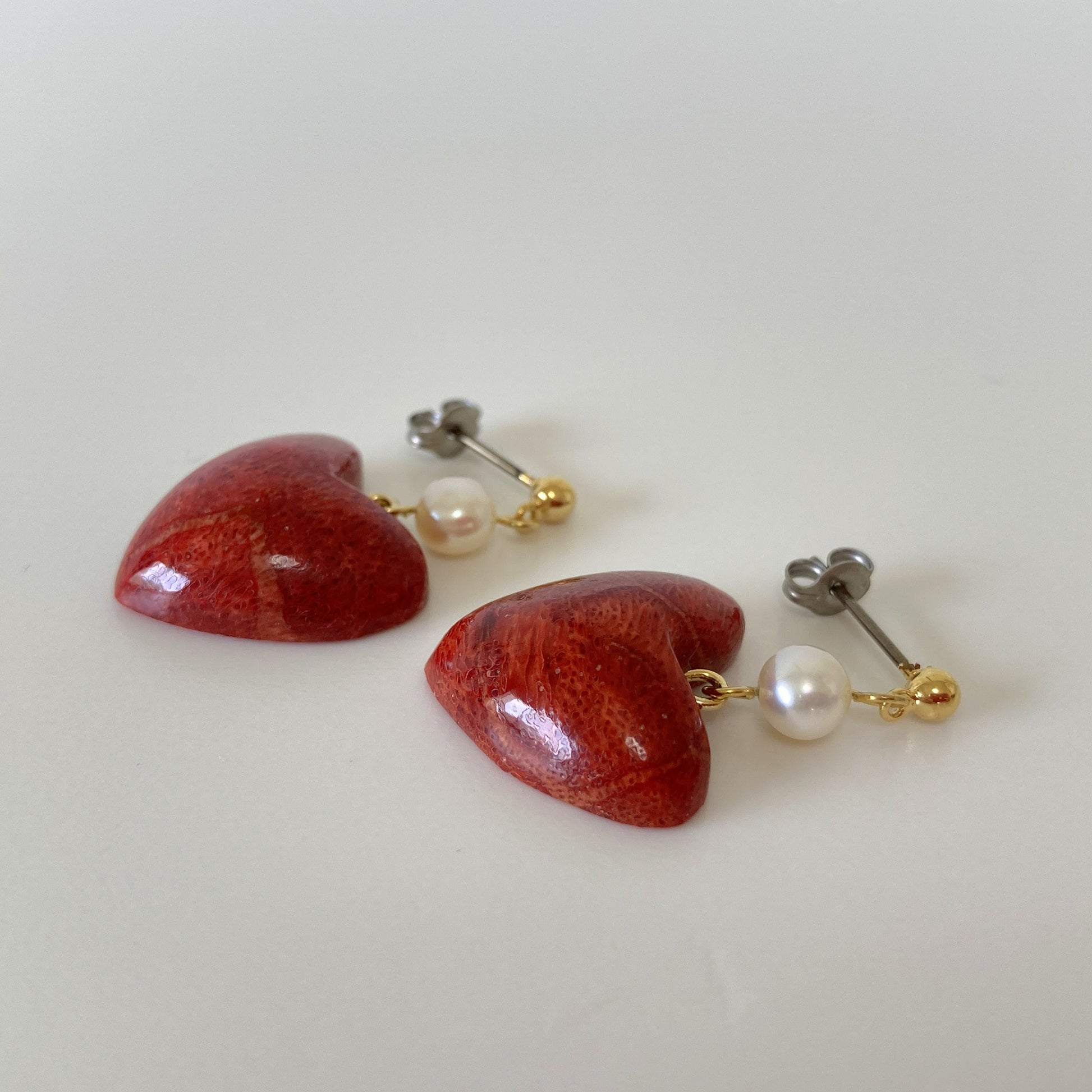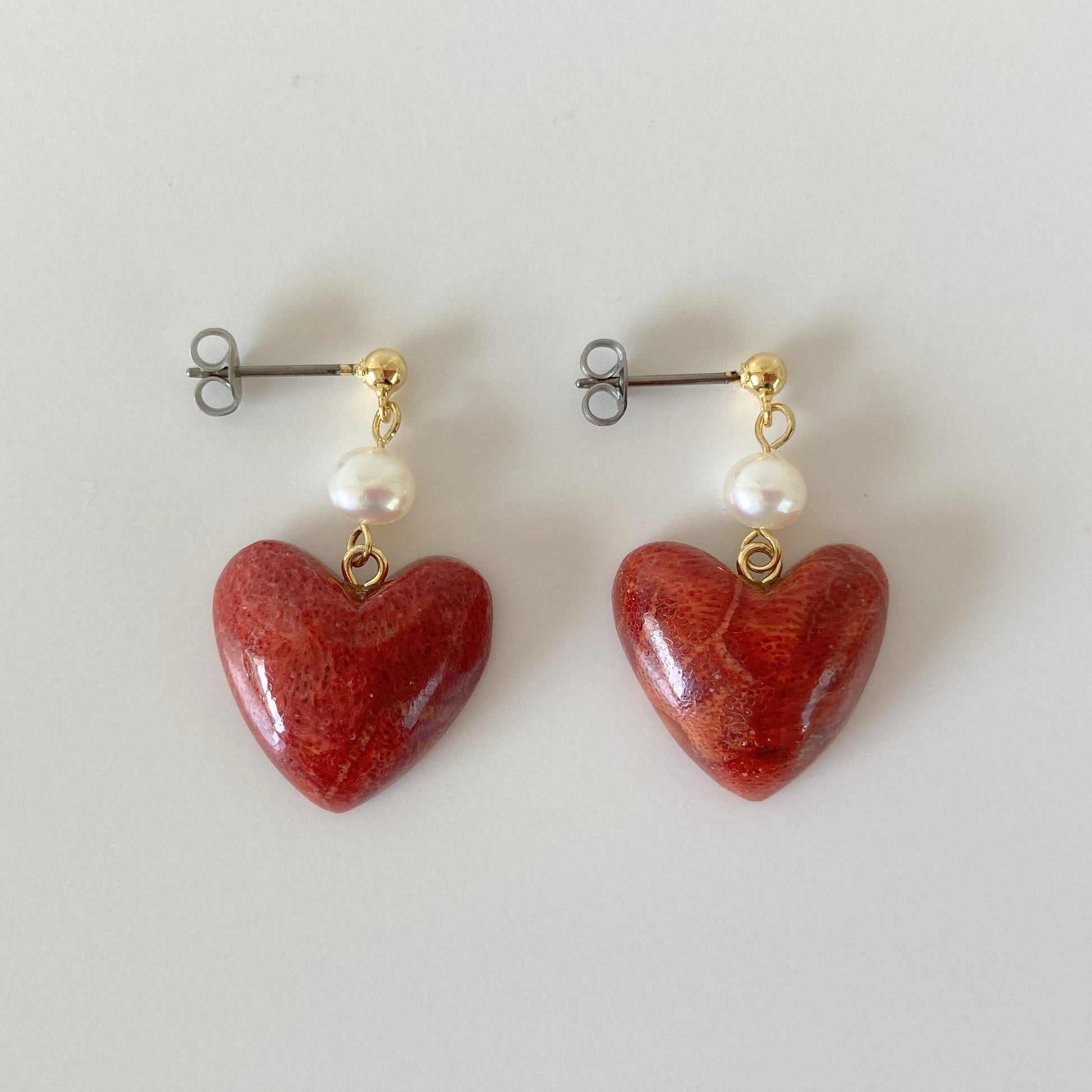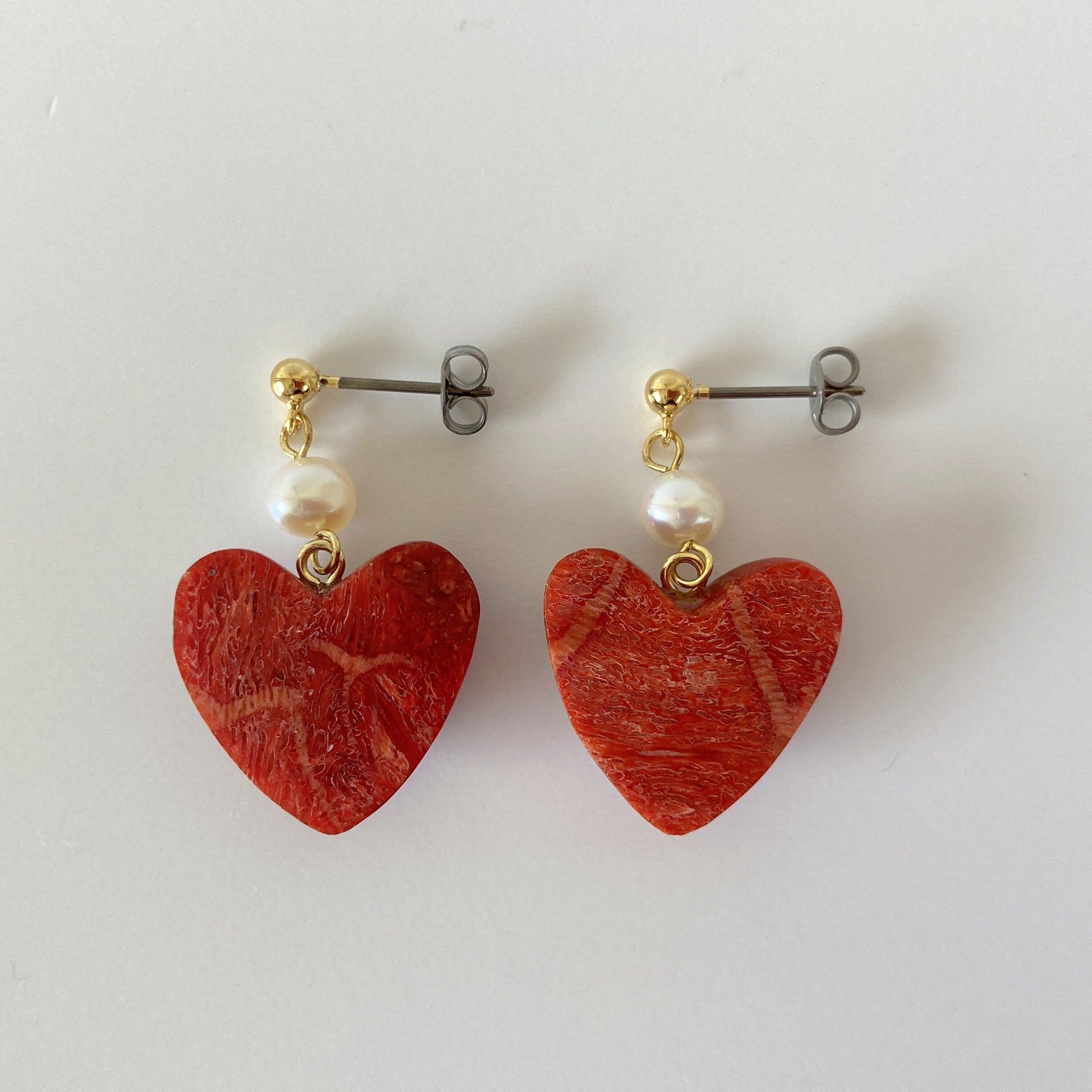 Sponge Coral Stud Earring or Screw Clip Earring, Heart shape natural African coral and fresh water pearl, Dangle and drop, Genuine coral