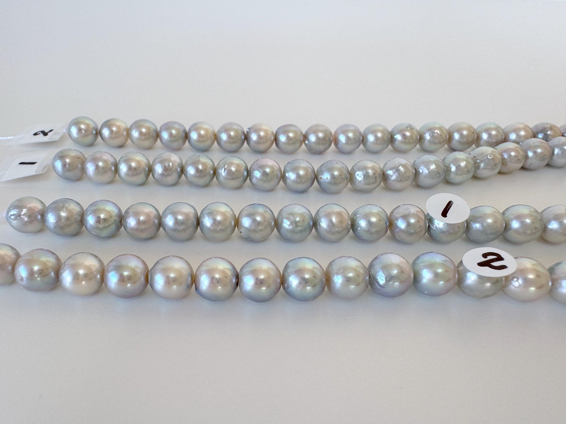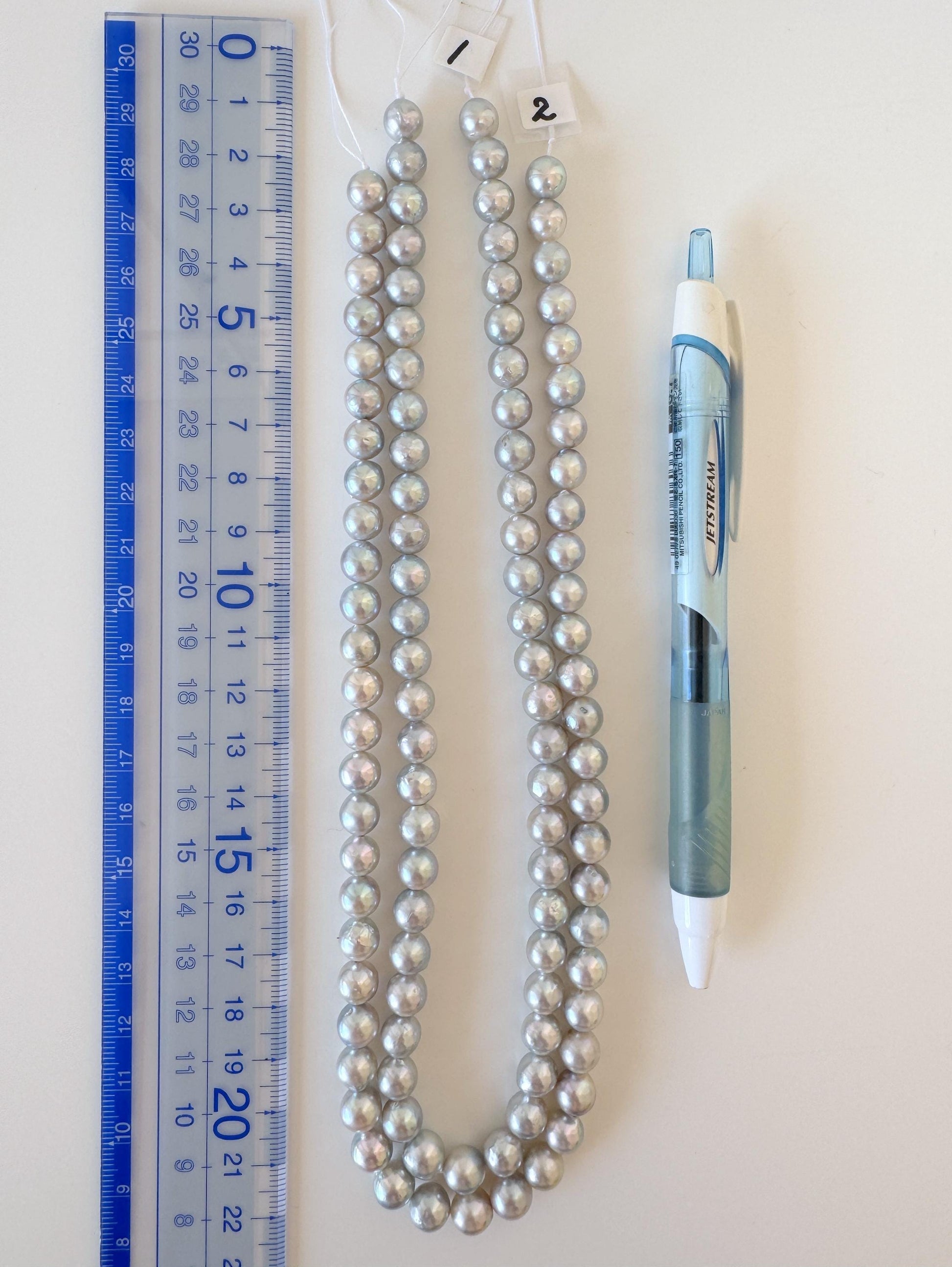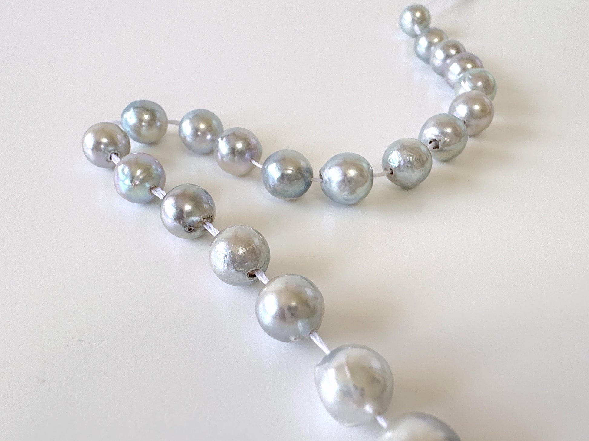This full strand of genuine Akoya pearl beads, cultured in saltwater and sourced directly from Iseshima, showcases a stunning natural blue silver hue, perfect for creating your own pearl necklace or jewelry masterpiece.