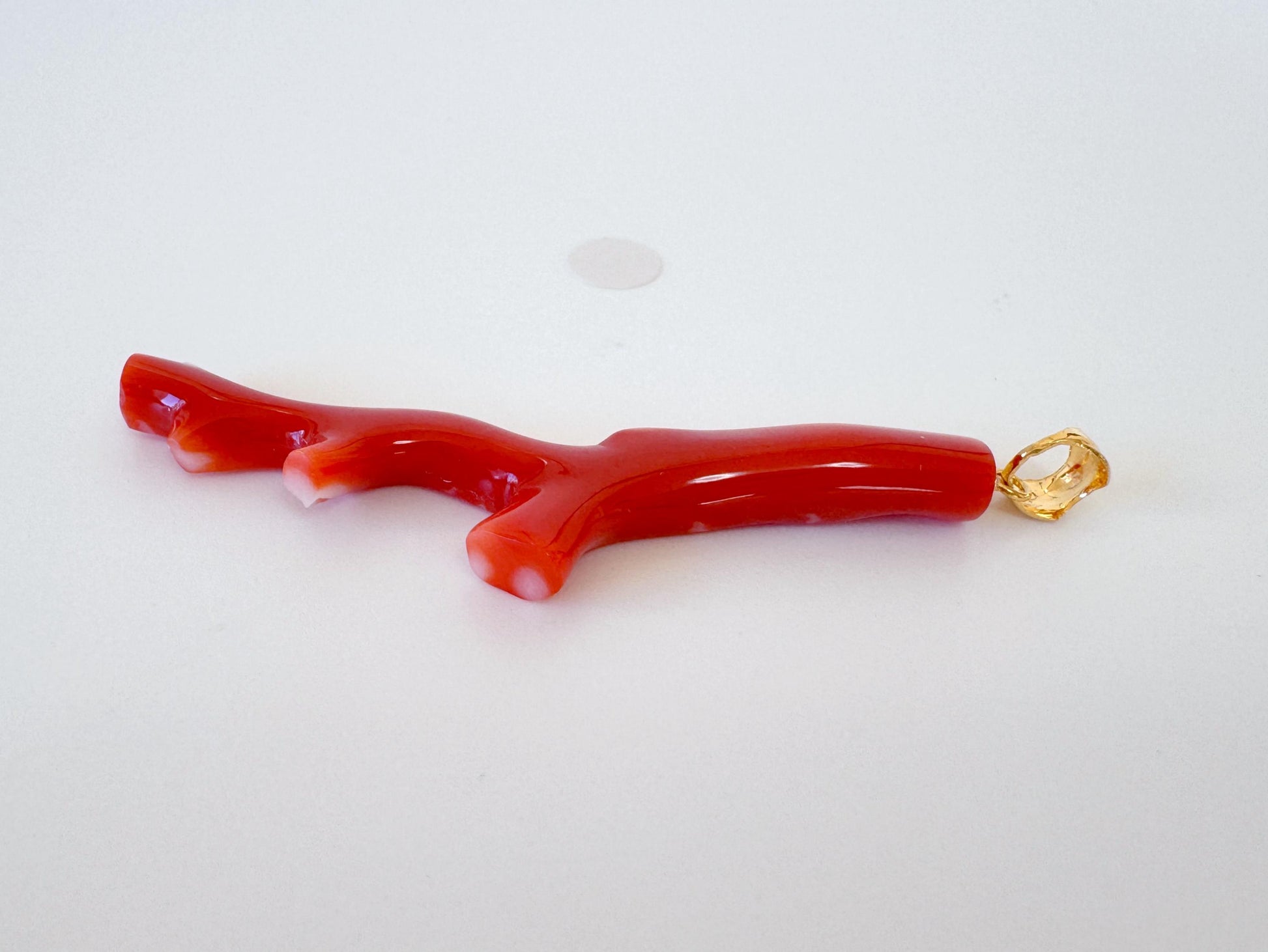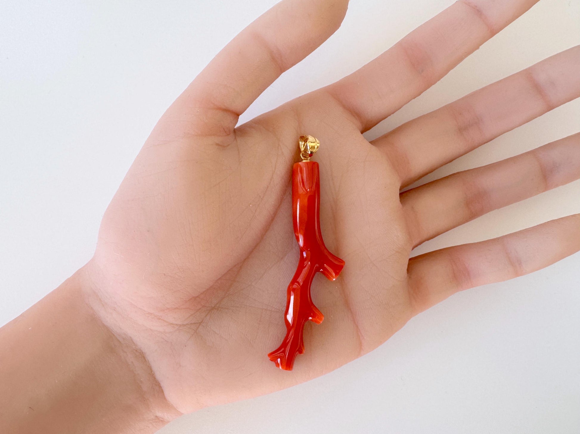 Natural Red Coral Branch Pendant: Japanese Aka Coral, Gold Plated Silver Bail, 55mm