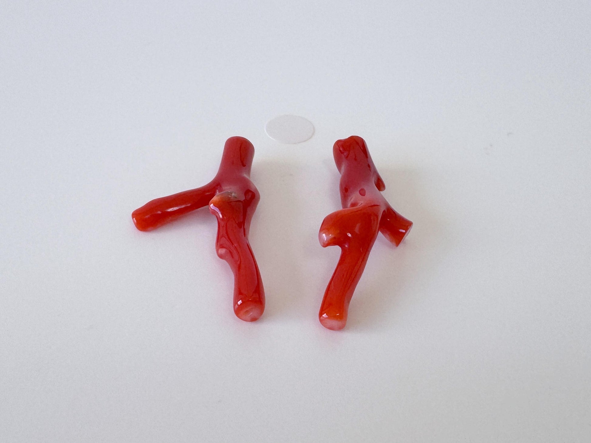 Japanese red(Aka) coral branch set for 2pcs, 31-32mm, Hole on Top, natural red color coral for jewelry making