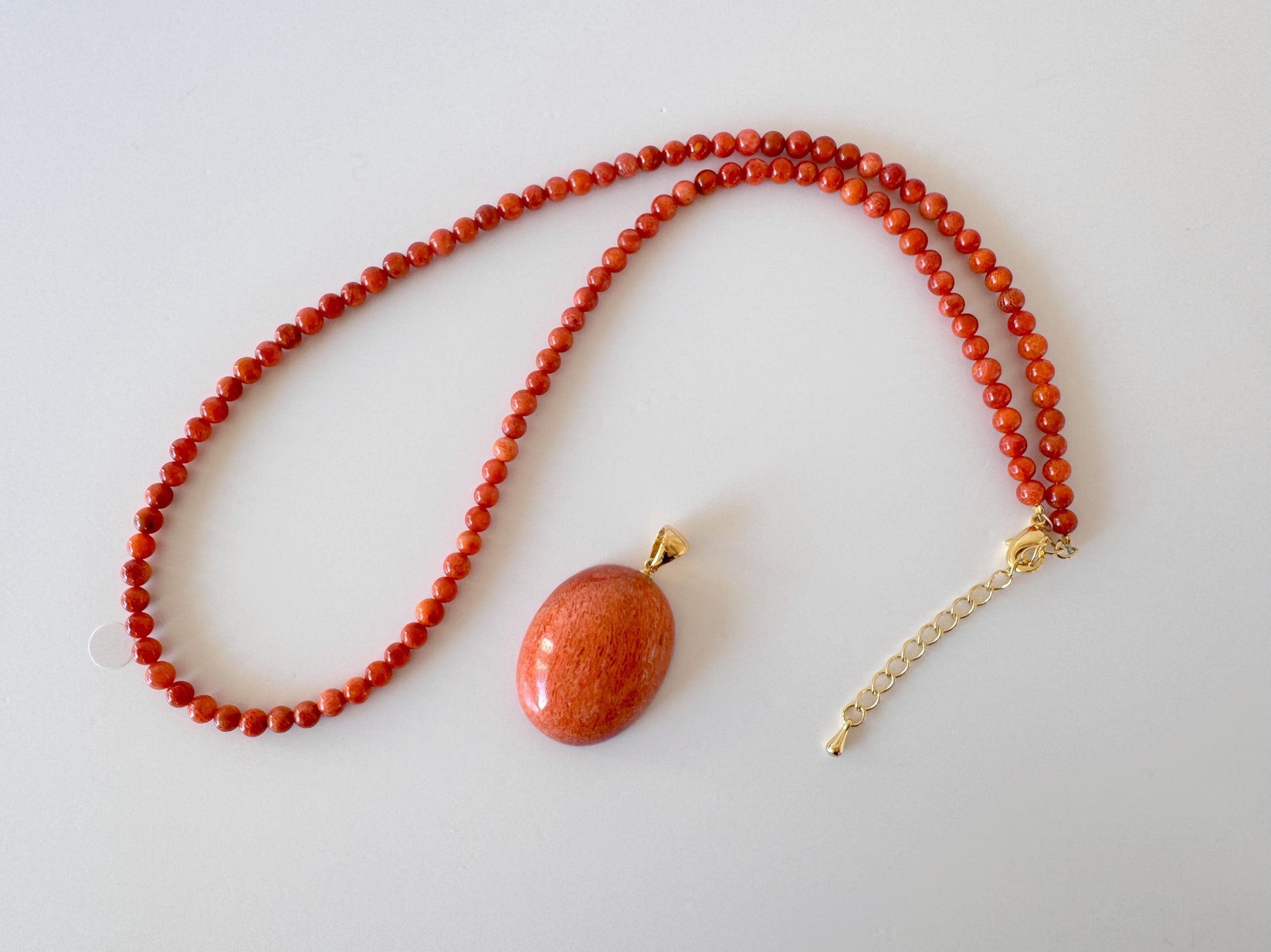 Sponge Coral Necklace with Oval Pendant, Bright Red, Brass Hook & Adjuster, Bail